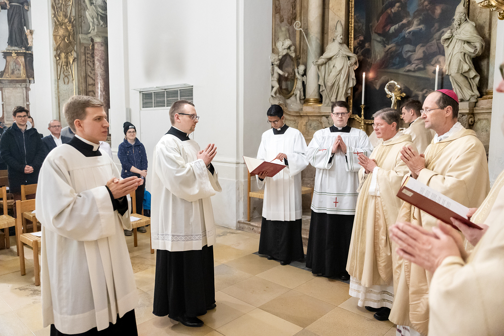 Die Admissio ist ein bedeutender Schritt auf dem Weg zur Weihe. In einer feierlichen Liturgie wird der Kandidat offiziell in die letzte Phase der Vorbereitung auf das Weihesakrament aufgenommen. Mit diesem Akt bekennt der Kandidat öffentlich seine Bereitschaft, den Dienst in der Kirche anzunehmen und seinen Weg der Berufung weiterzugehen. Diese Feier drückt die Anerkennung der Kirche aus und stärkt die Verbindung zwischen dem Kandidaten und der Gemeinschaft. Durch Gebet, Segen und Zuspruch wird der Kandidat auf seinem weiteren geistlichen Weg begleitet und ermutigt. Unter die Weihekandidaten aufgenommen wurden die Seminaristen Florian Gründker und Constantin Mucha. Wir waren mit der Kamera dabei.